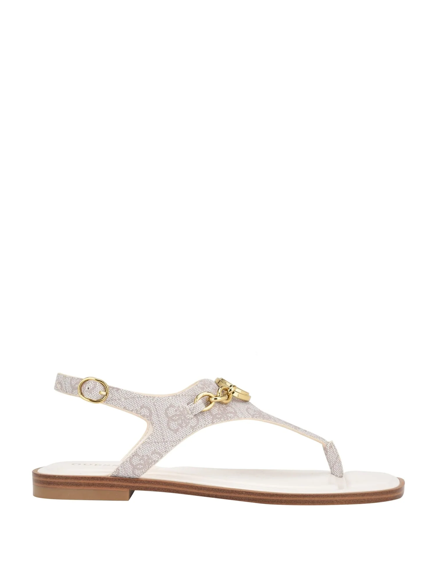 Get summer ready with our Ivory Rissy Logo Sandals. Perfect for pairing with a skirt or dress, these shoes are crafted from a synthetic upper material and feature an adjustable strap, gold hardware, GUESS logo detailing, and a square-toe.