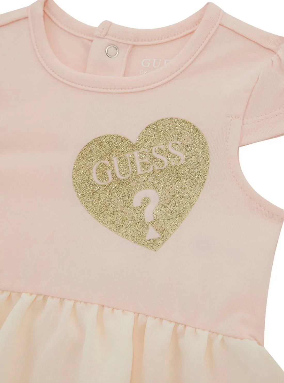 Delight in everyday elegance with the Pink Dress Bodysuit with Chiffon (0-12m). A charming fusion of comfort and style. Crafted from soft stretch cotton, this adorable piece features a short-sleeved bodysuit with an airy chiffon overlay that creates a sweet, dress-like silhouette. Complete with a subtle front logo and easy snap closures, it’s the perfect pick for sunny days, photo moments, or special occasions.