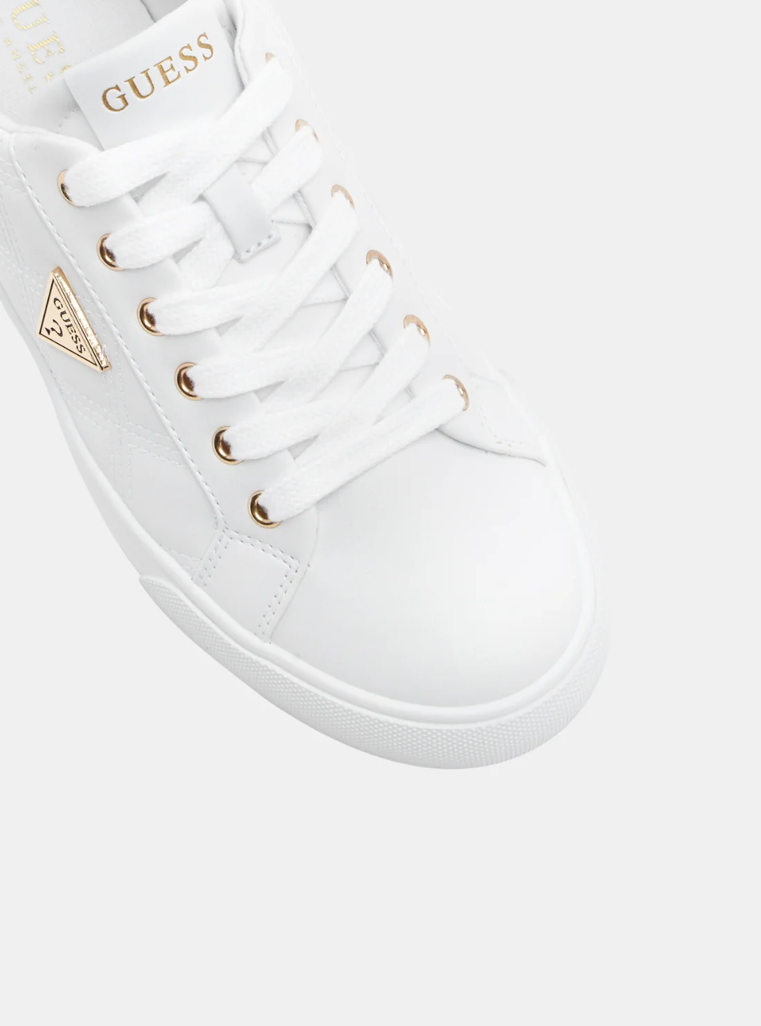 Step up your streetwear game with the White Garda Low-Top Sneakers. These low-top lace-up sneakers feature a quilted faux-leather upper with gold-tone hardware and signature GUESS branding for a polished finish. A comfortable rubber sole and cushioned insole ensure all-day comfort, while the sleek silhouette makes them perfect for everyday wear.